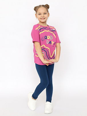 Трикотажная футболка оверсайз для девочки выполнена из мягкого хлопкового трикотажа. Свободный силуэт с заниженной линией плеча не сковывает движения. Модель дополнена круглым вырезом горловины и короткими рукавами. Перед декорирован ярким принтом с блестящим эффектом (надпись: Хорошего дня). Мягкие и комфортные лосины средней посадки с поясом на резинке.