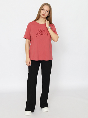 Футболка прямого силуэта длиной по линию бедер. Короткий рукав. Круглая горловина обработана узкой притачной обтачкой из рибаны с эластаном. Полочка декорирована вышивкой "никогда не переставай мечтать".