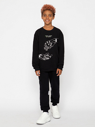 Джемпер с длинными втачными рукавами и притачными манжетами. Воротник, манжеты и пояс выполнены из полотна с эластаном. Перед декорирован принтом "Виртуальный мир без границ".