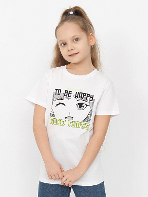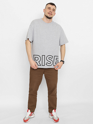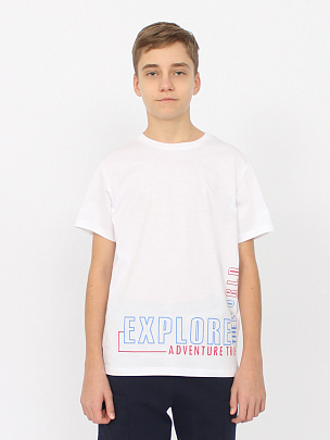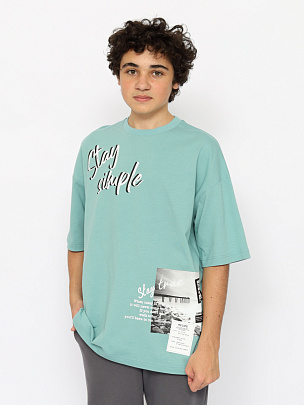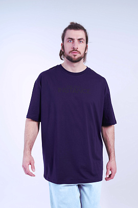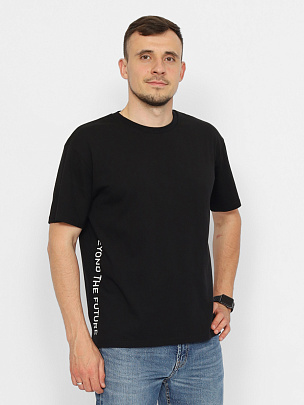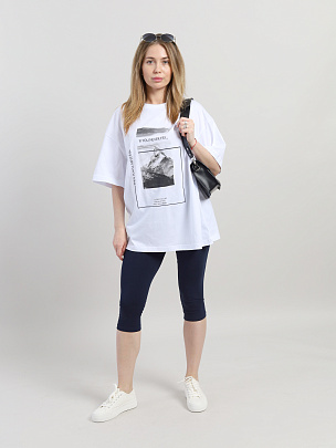 Футболка oversize со спущенным плечом, с коротким рукавом. Горловина круглая, обработана притачной бейкой из рибаны с лакрой. Плечевые швы смещены на перед и отстрочены. По переду вдоль правого бокового шва - текстовый принт.